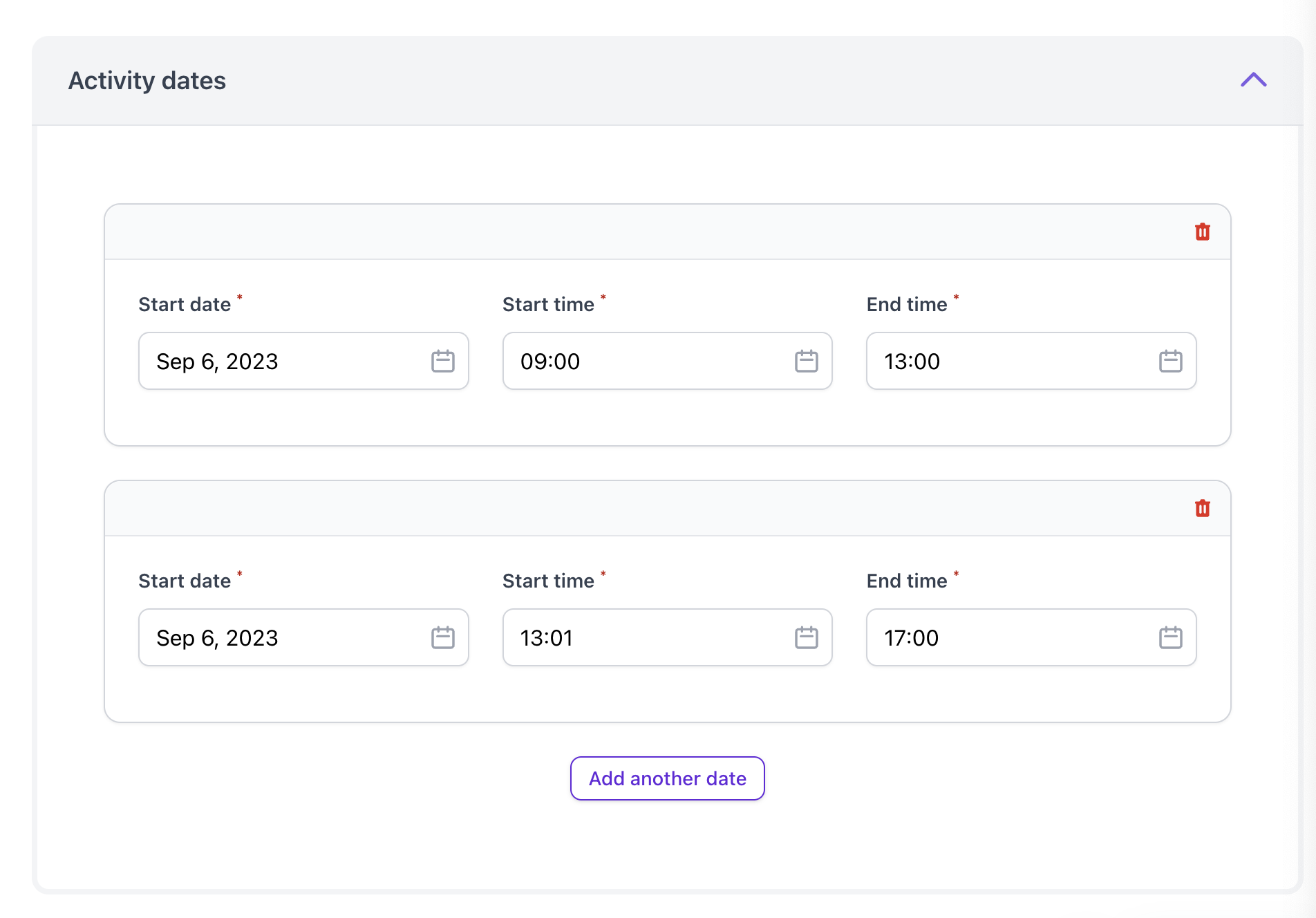 For example, if the session is 09:00-17:00, the times should be split into one activity 09:00-13:00 and another 13:01-17:00.